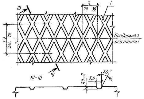Рабочая поверхность плит, изготовляемых этой поверхностью «вниз», должна иметь рифление. Рифление поверхности образуют путем применения в качестве днища поддона формы стального листа с ромбическим рифлением по ГОСТ 8568. Лист на поддоне располагают так, чтобы большая диагональ ромба была перпендикулярна к продольной оси плиты (черт. 5).