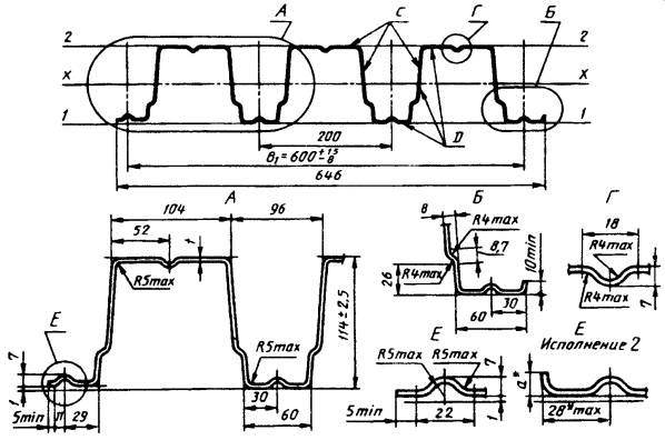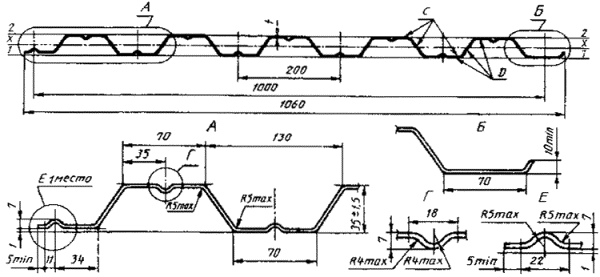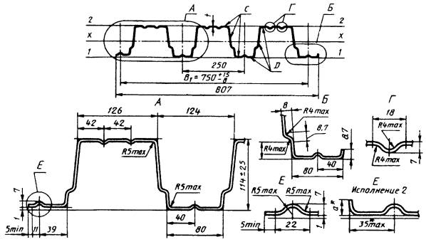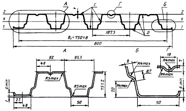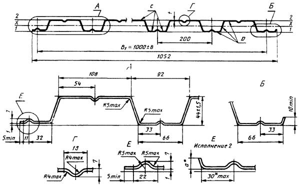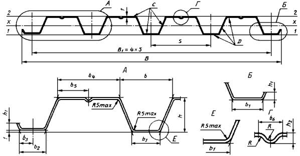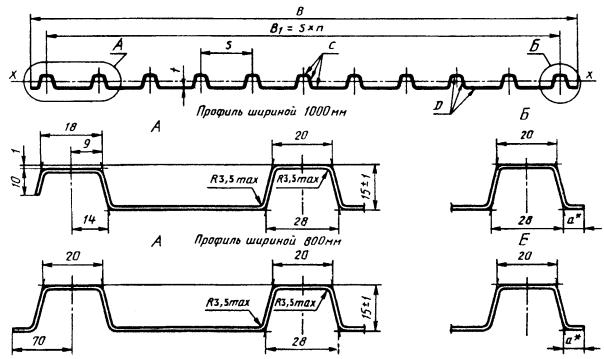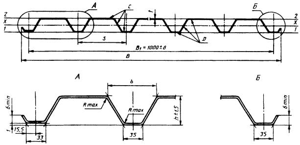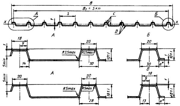 3.3 Форма, размеры, площадь сечения, масса 1 м длины, справочные величины на 1 м ширины профилированных листов и масса 1 м должны соответствовать указанным на рисунках 1-9 и в таблицах 1-8.