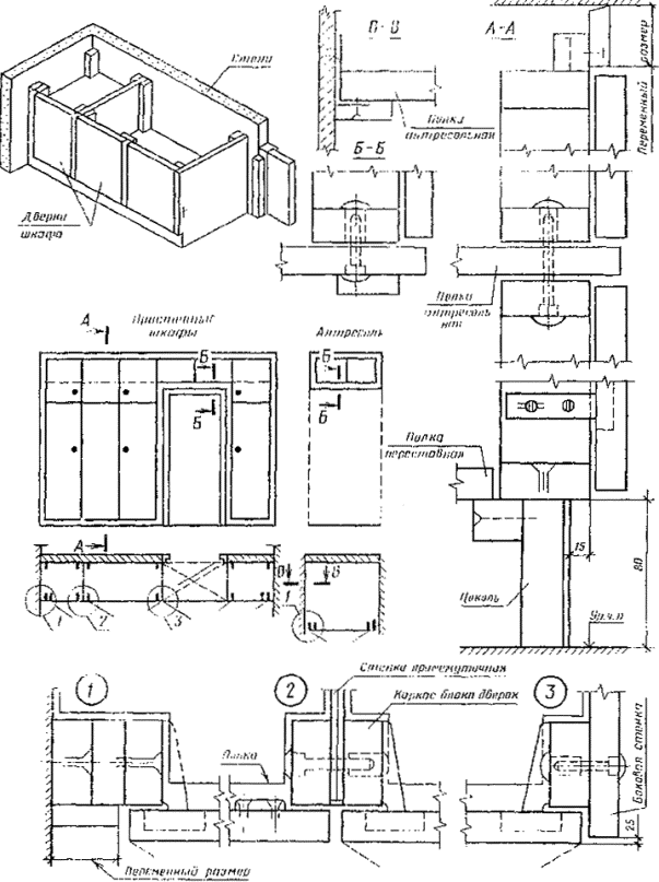 1.11. Примеры сочетания шкафов и антресолей по высоте и ширине, их компоновки в помещениях, разрезы и узлы приведены в рекомендуемых приложениях 1 и 2.