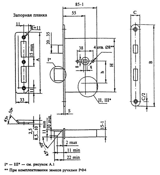Допускается изменение габаритов замков при комплектации тягами или другими устройствами, повышающими их стойкость к вскрытию.