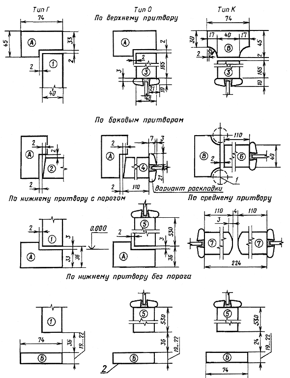 Сечения элементов полотен по кромкам внутренних и наружных дверей