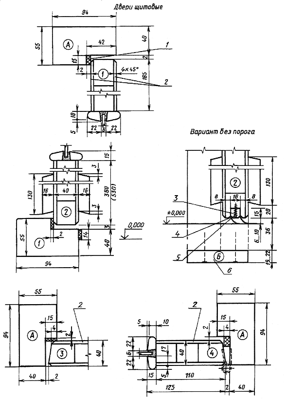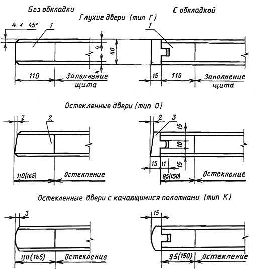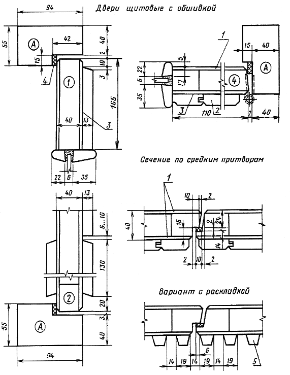 1 - облицовка ДВП, Т-400 по ГОСТ 4598-56; 2 - обшивка по ГОСТ 8242-75; 3 - пергамин по ГОСТ 2697-83; 4 - уплотняющая прокладка по ГОСТ 10174-72; 5 - раскладка типа 1 по ГОСТ 8242-88