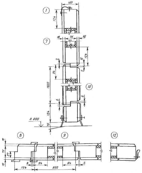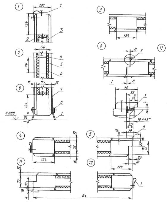 1 - листовая техническая резина толщиной 3 мм по ГОСТ 7338-77; 2,3 - наружная и внутренняя обшивка; 4 - оберточная бумага по ГОСТ 8273-75; 5 - упаковочная битумная бумага по ГОСТ 515-77; 6 - ДВП по ГОСТ 4598-74; 7 - тонколистовая оцинкованная сталь по ГОСТ 14918-80; 8 - стальная лента 20 ´ 2 мм по ГОСТ 6009-74; 9 - нащельник