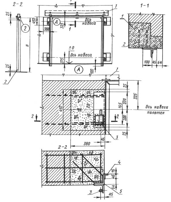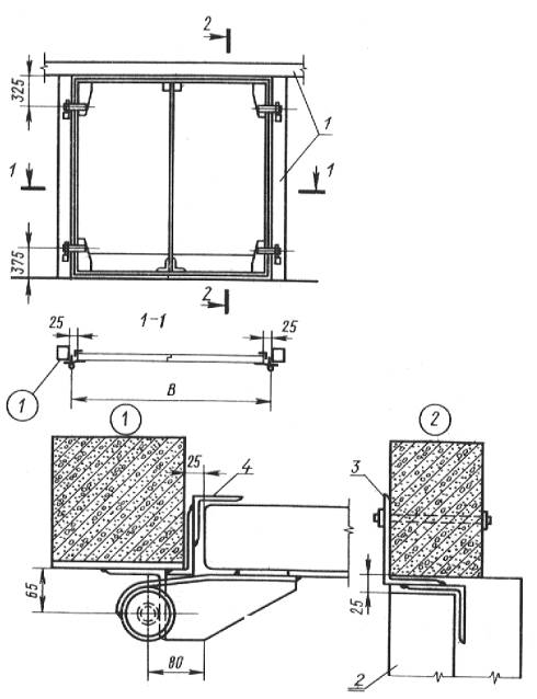 1 - железобетонный каркас; 2 - полотно ворот; 3 уголок 150´100´10; 4 уголок обрамления 45´45´5