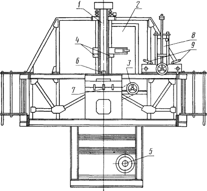 1 - стойка; 2 - испытуемое изделие; 3 - привод; 4 - рычаги-толкатели; 5 - гидробак; 6 - счетчик оборотов; 7 - пульт управления; 8 - нагружающее устройство, 9 - стопорное устройство.