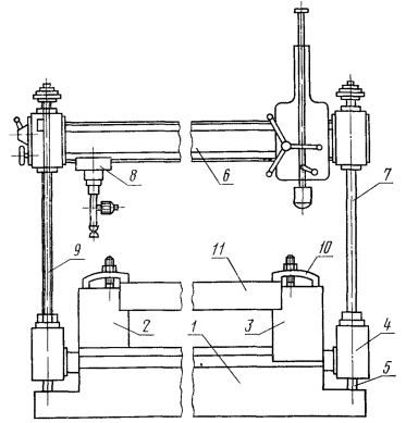 1 - основание машины; 2 - неподвижная опора; 3 - подвижная опора; 4 - каретка; 5 - направляющая каретки; 6 - траверса; 7 - колонка для перемещения траверсы; 8 - датчик сил; 9 - измеритель перемещений; 10 - прижимы; 11 - испытуемое изделие