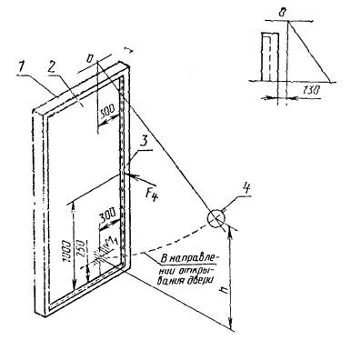 5.3.3. Испытание ударной нагрузкой, действующей в нижний свободный угол полотна при одновременном воздействии статической нагрузки F4 в зоне запирающего прибора на плоскости полотна в направлении открывания двери.