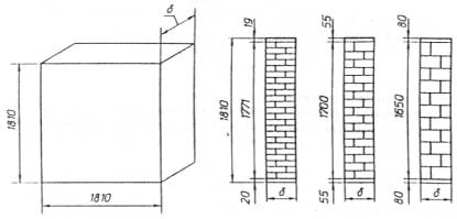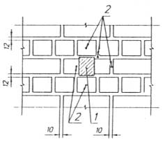 - по толщине (d) - исходя из условий наличия одного тычкового и одного ложкового рядов кирпичей или камней. Для изделий с горизонтальным расположением пустот фрагмент по толщине изготавливают в двух вариантах: первый - из тычкового ряда изделий, второй - из ложкового;
