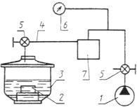 1 - вакуумный насос по ГОСТ 26099; 2 - образцы изделий; 3 - вакуумный эксикатор исполнения 1 по ГОСТ 25336 или любая другая разъемная емкость с вакуумным уплотнением; 4 - вакуумный шланг; 5 - вакуумный кран; 6 - образцовый манометр по ГОСТ 2405; 7 - ловушка