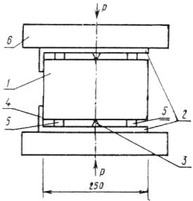 1 - образец; 2 - основание; 3 - металлический нож; 4 - упор; 5 - резиновые прокладки; 6 - плита пресса