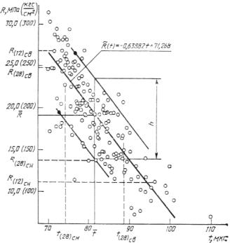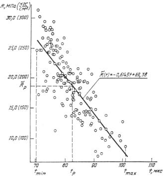 в указанном диапазоне времени распространения ультразвука допускается. Результаты установления градуировочной зависимости представлены на черт. 3. Если в испытаниях р-го образца получено значение tp = 82,7 мкс, то прочность этого образца, определенная по градуировочной зависимости, составит