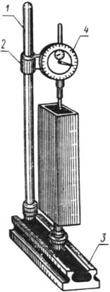 Измерительный стержень индикатора должен иметь на конце полушаровое углубление. На подставке стойки 1 на одной оси с измерительным стержнем должна быть расположена неподвижная опора с полушаровым углублением.