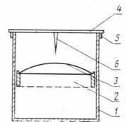 1 - цилиндрический сосуд; 2 - пригружающий пуасон; 3 - петля; 4 - металлическая пластина; 5 - ограничители; 6 - стрелка.