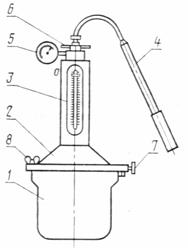 1 - чаша; 2 - крышка; 3 - водомерная трубка; 4 - ручной насос; 5 - манометр; 6 - входной вентиль; 7 - сливной вентиль; 8 - накидной болт.