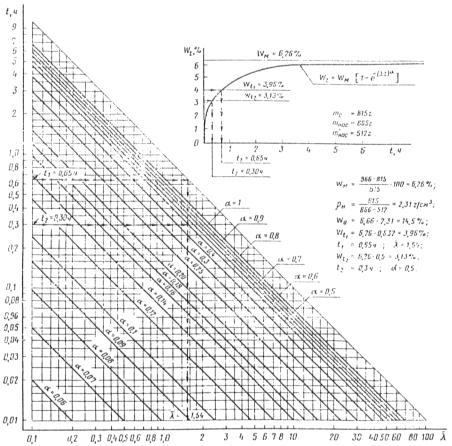 Номограмма и пример расчета параметров пористости по кинетике насыщения материала жидкостью (дискретный метод)