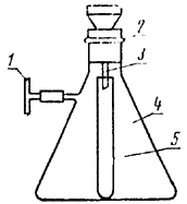 1-водоструйный насос; 2-резиновая пробка; 3-воронка Бюхнера; 4-склянка Бунзена; 5-пробирка для сбора фильтрата
