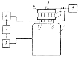 1 - электродинамический вибратор; 2 - столик вибратора; 3 - испытываемый образец; 4 - груз; 5 - акселерометры; 6 - измерительный усилитель; 7 - измерительный генератор; 8 - усилитель мощности; 9 - виброизмеритель