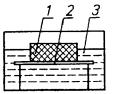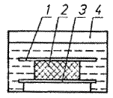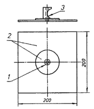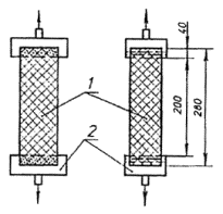 Е.7 При помощи битумной мастики приклеивают к образцу две жесткие плоские пластины (рисунок E1). При приклеивании прикладывают давление, величина которого не больше, чем давление, достаточное для хорошего контакта поверхностей пластин и образца.