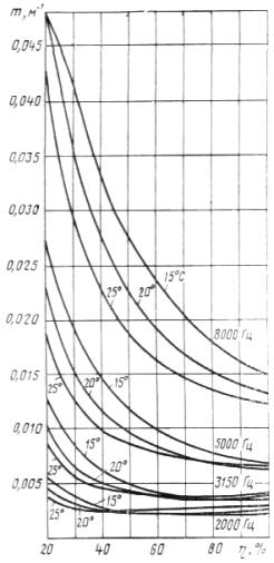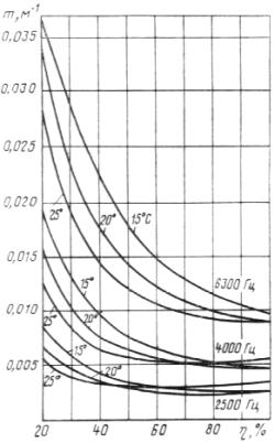 т - коэффициент звукопоглощения в воздухе, определяемый по черт. 1 и 2, в зависимости от частоты, влажности и температуры, м-1 (учитывается для частот выше 2000 Гц). Для значений температур, не показанных на черт. 1 и 2, коэффициент т следует определить по интерполяции;