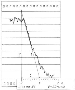 Кривая реверберации, записанная на бумажной ленте записывающего устройства, представляет собой волнистую линию, проходящую под углом к горизонтальным линиям децибельной сетки. Для оценки следует провести две прямые линии (см. чертеж). Линия 1 аппроксимирует начальный участок кривой реверберации от стационарного уровня до отметки минус 20 дБ относительно этого уровня, либо до характерного излома этой кривой. Линия 2 - перпендикуляр, опущенный из точки пересечения линии с верхней линией децибельной шкалы к горизонтальным линиям шкалы.