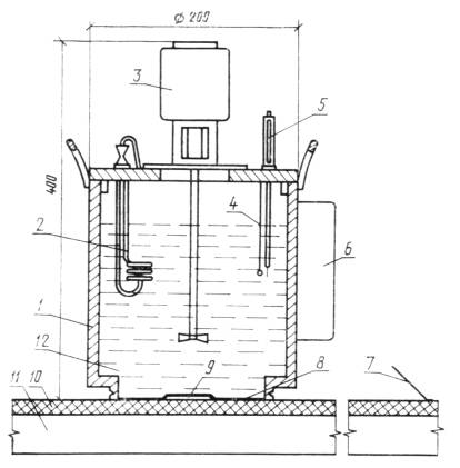 1 - сосуд цилиндрической формы; 2 - электронагреватель трубчатый; 3 - электромешалка; 4, 7 - термопары; 5 - электроконтактный термометр; 6 - блок управления; 8 - дно из полиэтиленовой или поливинилхлоридной пленки; 9 - тепломер (измеритель теплового потока); 10 - испытуемый образец; 11 - бетонная плита; 12 - дистиллированная вода