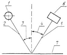 1 - источник света; 2 - ось светового пучка, падающего на образец; 3 - угол падения; 4 - угол отражения; 5 - ось светового пучка, отраженного от образца; 6 - фотоприемник; 7 - плоскость измерений