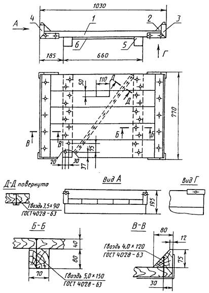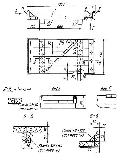 2.4. Соединение деревянных деталей поддонов должно производиться гвоздями по ГОСТ 4028-63. Головки гвоздей не должны выступать из поверхности настилов и брусков, а выступающие острые концы гвоздей должны быть загнуты и утоплены в древесину поперек ее волокон.