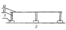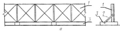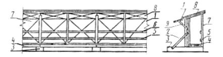 1 - панель ограждения; 2 - подкос панели; 3 - опора (лежень); 4 - панель тротуара; 5 - горизонтальный элемент перил; 6 - поручень; 7 - стойка перил; 8 - панель козырька; 9 - подкос козырька; 10 - стойка ограждения; 11 - пеньковый или капроновый канат, проволока