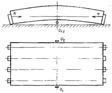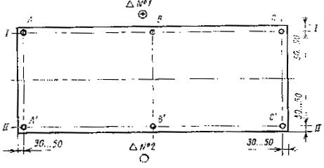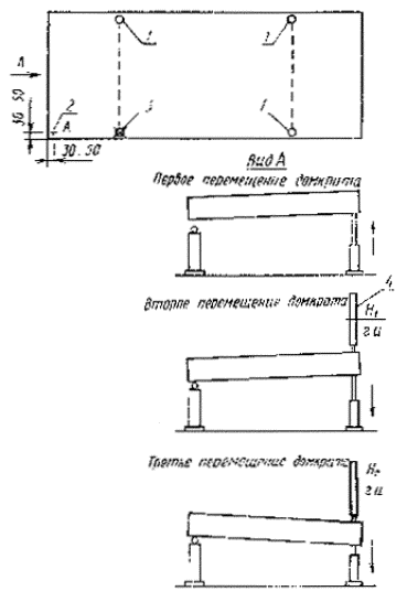 3. Места установки индикаторов зависят от характера деформации при приложении продольной нагрузки. Если под действием момента, создаваемого силой натяжения арматуры, приподнимаются торцы формы, то на расстоянии 30 - 50 мм от краев (черт. 1 настоящего приложения) устанавливают четыре индикатора, а если под действием момента форма приподнимается в середине, то по поперечной оси (черт. 2 настоящего приложения) устанавливают два индикатора.