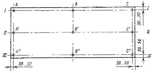 5.3.2. На бортах отмечают три сечения, в которых предполагают проводить измерения: по поперечной оси и на расстоянии 30 5 мм от бортов противоположного направления.