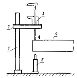 1 - стойка; 2 - уголок (измерительная база); 3 - штангенциркуль; 4 - форма; 5 - домкрат