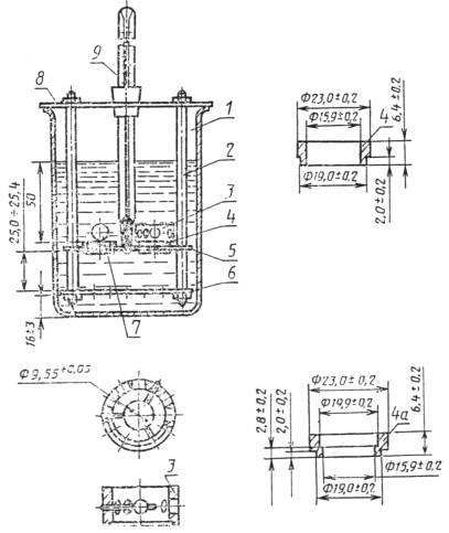 1 - стеклянный стакан; 2 - штатив; 3 - накладка; 4 - латунное гладкое кольцо; 4а - латунное ступенчатое кольцо; 5 - верхняя пластинка; 6 - нижняя пластинка; 7 - шарик; 8 - крышка; 9 - термометр