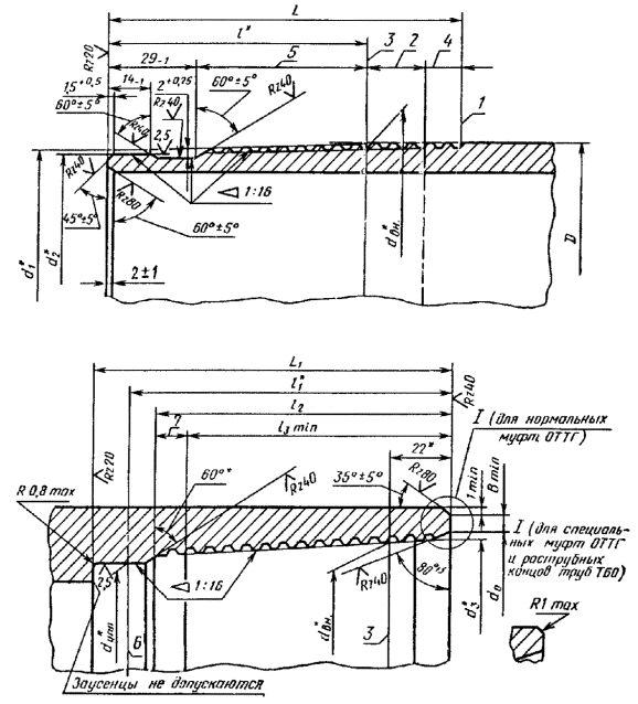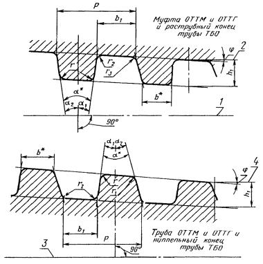 4.12. Натяг резьбы муфт к трубам ОТТМ и ОТТГ и раструбных концов труб ТБО должен проверяться гладким и резьбовым калибрами-пробками.