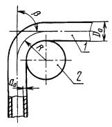 1 - образец-патрубок; 2 - цилиндрическая оправка; R - радиус загиба трубы на средней линии