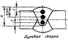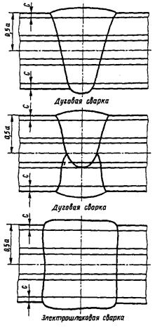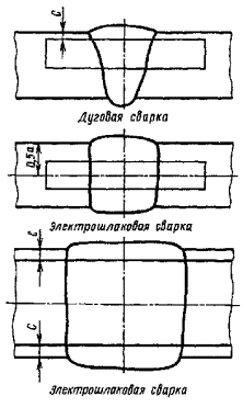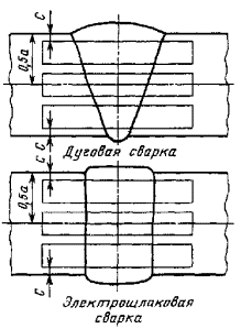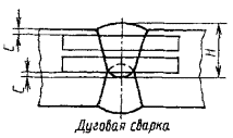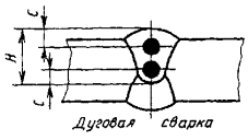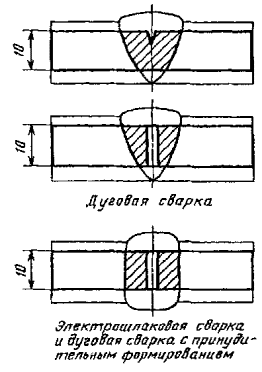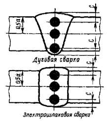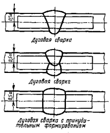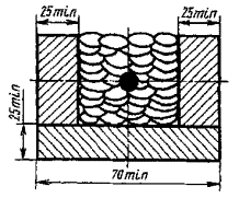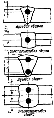 - при автоматической и полуавтоматической дуговой сварке под флюсом на токе до 1000 А, при электрошлаковой сварке и дуговой сварке с принудительным формированием - не менее 40 мм в начале и не менее 70 мм в конце шва;