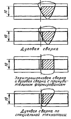 - при автоматической и полуавтоматической сварке с любым типом защиты, кроме флюса, при толщине металла до 10 мм - не менее 15 мм в начале и не менее 30 мм в конце шва, а при толщине металла более 10 мм - не менее 30 мм в начале и не менее 50 мм в конце шва;