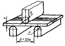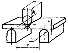 6.1. Испытуемый образец помещается на две параллельно расположенные роликовые опоры. Образец медленно и непрерывно деформируется путем приложения в средней части образца по оси шва перпендикулярно поверхности образца концентрированной нагрузки (трехточечный изгиб).