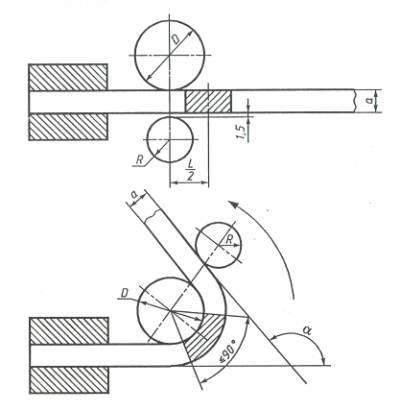7.1. Один конец образца жестко закрепляется в устройстве для испытания, имеющем два параллельных ролика. Испытание должно проводиться медленно и непрерывно сосредоточенной нагрузкой, передаваемой на образец при помощи внешнего вращающегося ролика с радиусом R. Изгиб осуществляется по дуге, центр которой совпадает с центром внутреннего ролика.