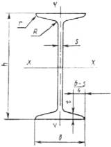 h — высота двутавра; b — ширина полки; s — толщина стенки; t — средняя толщина полки; R — радиус внутреннего закругления; r — радиус закругления полки