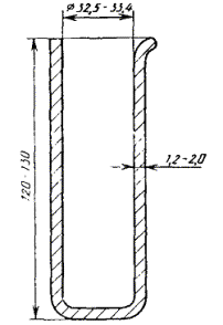 2.2. Сосуд для образца из прозрачного бесцветного стекла. Для арбитражных испытаний используют стеклянный цилиндр, показанный на чертеже. Для обычных испытаний можно использовать стеклянный цилиндр, применяемый при определении температур помутнения и застывания, т.е. цилиндрический сосуд с плоским дном, внутренний диаметр которого 30 - 33,5 мм, а высота наружной части 115 - 125 мм.