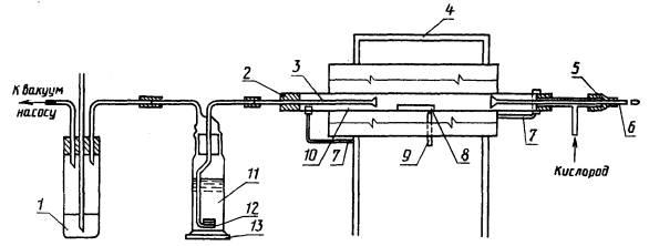 1 - ртуть; 2 - жаростойкая пробка; 3 - трубка-приемник; 4 - печь; 5 - резиновая втулка; 6 - кварцевый толкатель; 7 - опора для трубки; 8 - лодочка; 9 - термопара; 10 - трубка для сжигания; 11 - раствор перекиси водорода; 12 - диск из пористого стекла (размер пор 15 - 40 мкм); 13 - склянка для очистки газа