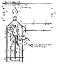 1 - корзина подвески баллона к динамометру; 2 - баллон; 3 - насадка для баллона; 4 - трубка для подсоединения баллона к линии жидкого сернистого ангидрида и линии абгазов; 5 - накидные гайки; 6 - сифон; 7 - динамометр; В1 и В4 - вентили для жидкого сернистого ангидрида; В2 и В5 - абгазные вентили; В3 - вентиль для эвакуации сернистого ангидрида из линии жидкого сернистого ангидрида