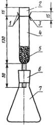 1 - стеклянные крючки; 2, 4- стеклянные трубки; 3 - бромнортутная бумага; 5 - вата, смоченная раствором ацетата свинца; 6 - резиновая пробка, 7- коническая колба.