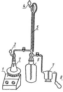 1 - магнитная мешалка, 2 - колба Фишера, 3, 4 - хлоркальцевые трубки, заполненные силикагелем-индикатором; 5 - бюретка с автоматической установкой нуля 5 - склянка из темного стекла, 7 - склянка Тищенко, заполненная силикагелем, 8 - нагнетательная груша
