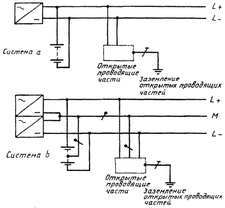 На рисунках 31А - 31Е даны примеры типов систем заземления для обычно используемых трехфазных сетей переменного тока. На рисунках 31F - 31К даны примеры типов систем заземления сетей постоянного тока. Используемые на рисунках буквенные обозначения имеют следующий смысл.