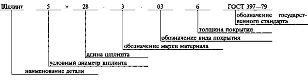 6.1. Шплинты следует обозначать по схеме, указанной на примере шплинта с условным диаметром 5 мм, длиной 28 мм, из латуни Л63 с никелевым покрытием толщиной 6 мкм.
