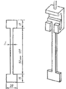 2.1.1. Для испытания применяют образцы в форме полосок с расширенными концами для закрепления в зажимах. Ширина узкой части образца должна быть (5,0 ± 0,2) мм, толщина (2,0 ± 0,2) мм, длина (50 ± 1) мм или (100 ± 1) мм. Образец и схема его установки в зажиме приведены в справочном приложении 3.