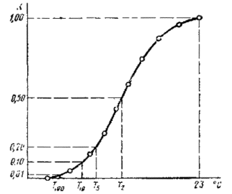 2.5.3. Для каждого образца строят зависимость коэффициентов морозостойкости от температуры испытания и определяют значения температур, при которых модули возрастают в 2, 5, 10 и 100 раз по сравнению с модулем, при температуре (23 ± 2) °С. Этим температурам соответствуют коэффициенты морозостойкости 0,50; 0,20; 0,10 и 0,01. Вычисляют среднее арифметическое каждой из температур Т2, Т5, Т10, Т100 и округляют его до целого числа.