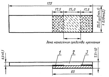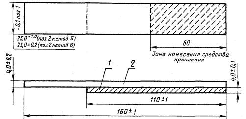 2.5. Перед склеиванием поверхности металла и резины обрабатывают в соответствии с требованиями, указанными в НТД или технической документации на клей, резину или изделие. На металлической пластине отмечают при помощи линейки карандашом зону нанесения средства крепления, как указано на черт. 1 и 2. Допускается зону нанесения средства крепления ограничивать рисками глубиной и шириной не более 0,3 мм.