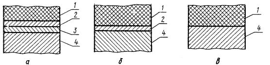 а - при применении двух клеев; б - при применении одного клея; в - при бесклеевом креплении
